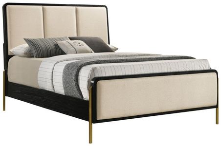 Elevate your coastal bedroom with this stunning panel bed, designed with retro-inspired elements and luxurious details. Cream fabric upholstery on the headboard and footboard is framed by a sleek black edge, creating a bold contrast and soft texture. The aged brass metal legs introduce a metallic accent that enhances its glamorous appeal.Read More
