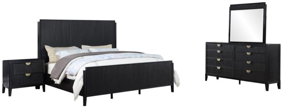 A rich black finish creates a sophisticated palette for a four-piece modern bedroom set. Complete with wire brushing that creates texture, the set features fluted details that add elegance and character. The bed features an open silhouette with a low footboard, while a tall headboard centers your space.Read More