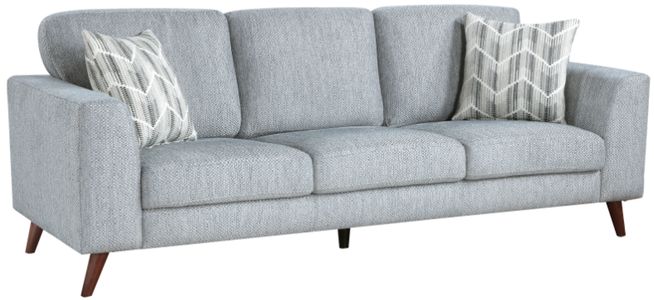 The soft, textured blue-gray fabric upholstery complements a variety of décor styles, while the faux wood brown finish legs provide a warm and stylish foundation. Two decorative pillows add a touch of pattern and comfort. The clean lines and tapered legs embody the timeless aesthetic of mid-century design, making this sofa a perfect addition to any living room, family room, or entertainment area. Enjoy the perfect blend of style, comfort, and functionality with this contemporary sofa.