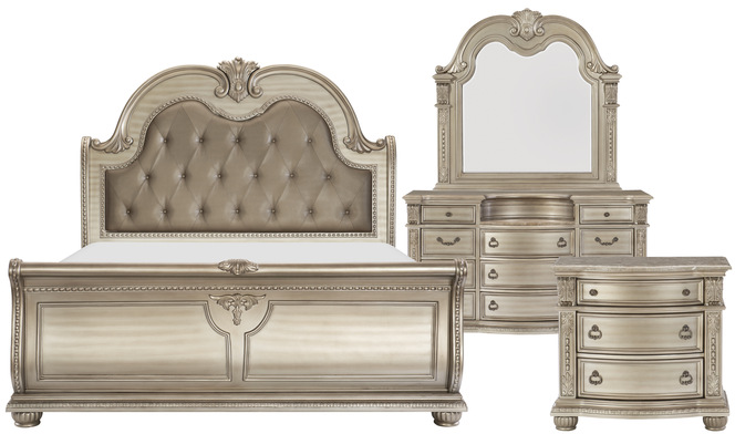 The Homelegance® Cavalier 4-Piece Silver Queen Bedroom Set features egg and dart base moldings, marble inset tops, and a faux leather, button tufted headboard insert. The Cavalier Collection exemplifies the finest in Old World European design inspiration.Read More