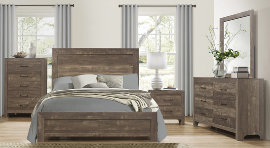 The Homelegance® Corbin Queen 5-Piece Bedroom Set features a faux wood veneer, black metal hardware, and subtle framing on the profile of the headboard and footboard. Modern lines and rustic styling are paired to create the look of the Corbin Collection.Read More