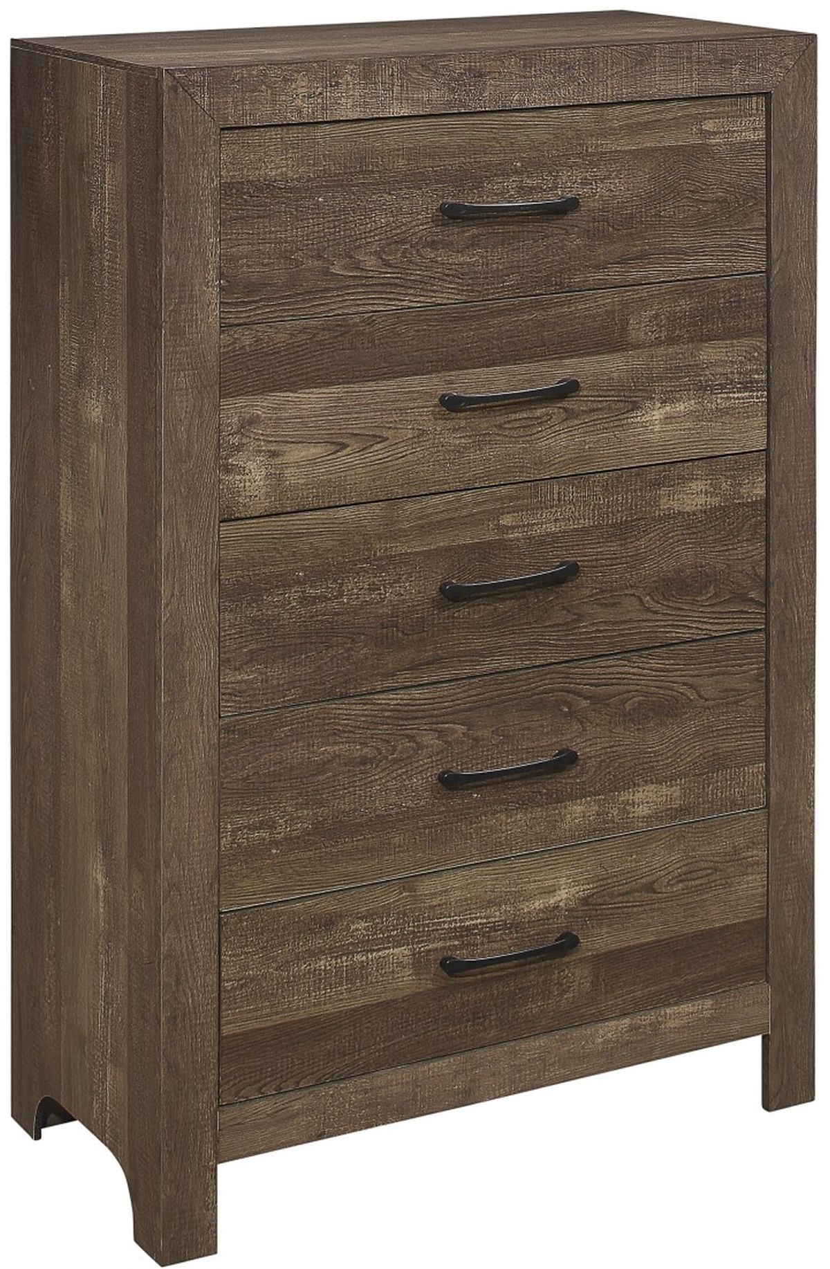 Modern lines and rustic styling are paired to create the look of the Corbin Collection. The embossed faux-wood veneer’s texture is highlighted by a rustic brown finish for a realistic wood look. Providing complementing contrast, the drawer fronts of the nightstand feature black metal hardware. Subtle framing defines the profile of the nightstand, further lending to the unfettered design of the collection.