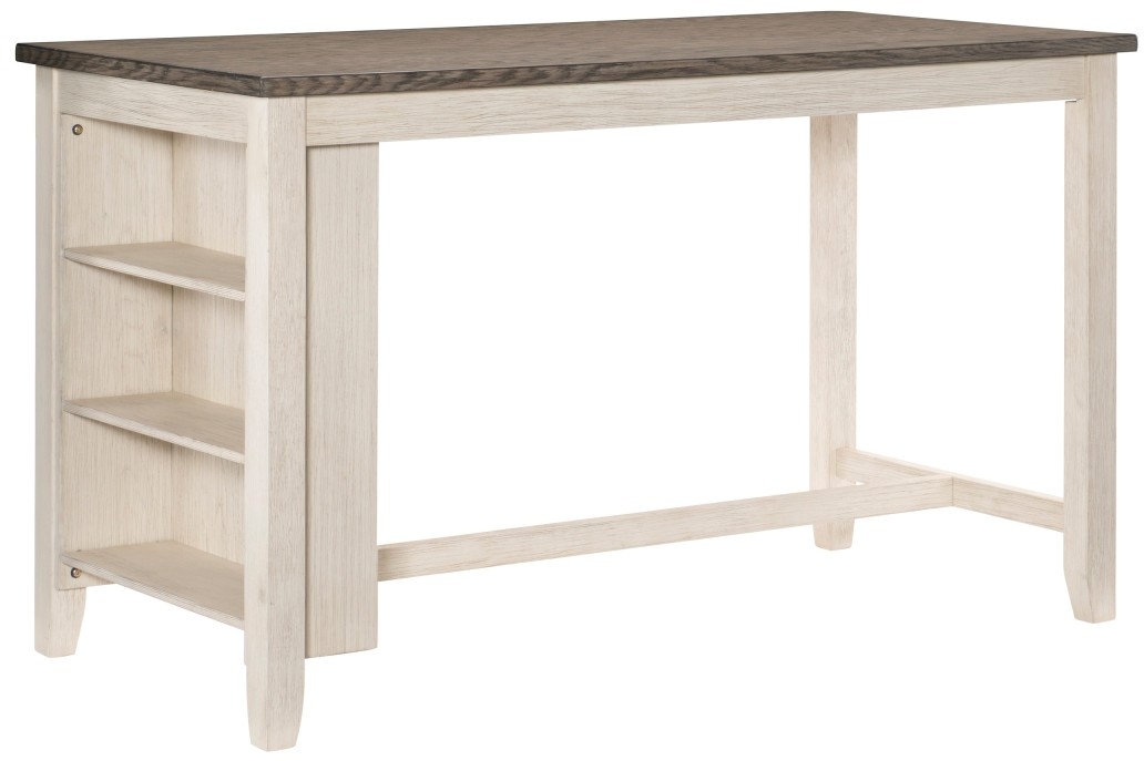 The multifunctional design of the Timbre Collection will be the perfect addition to your dining nook. A built-in bookcase provides open display space to this counter height offering. Wire brushed acacia veneer is highlighted by a whitewash finish. Grey fabric seats top the accompanying stools and feature nailhead accent for added decorative flair.Read More
