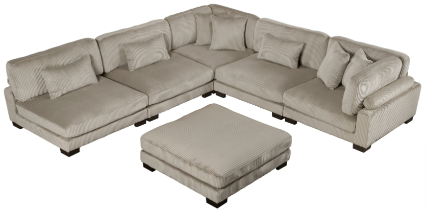 Configurable to your available space, the Traverse Collection allows for the addition and detachment of pieces for a customized seating experience. The 6-piece sectional configuration consists of two corner units paired with three armless chairs, and ottoman. The plush taupe corduroy fabric upholstery creates a plush expanse for a soft touch experience.Read More