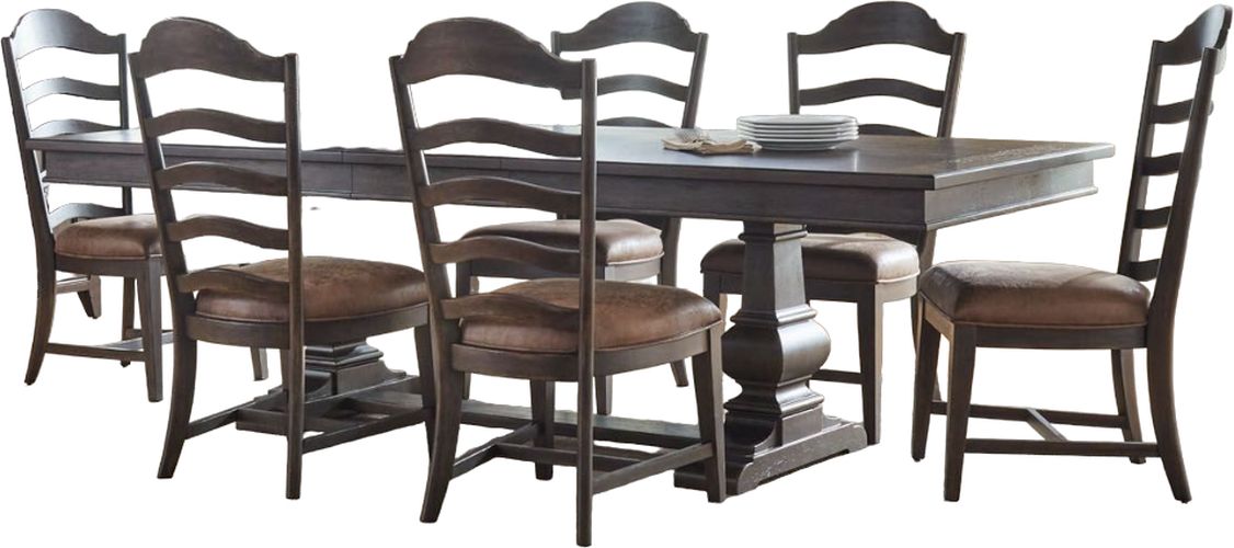 Includes the trestle table and six (6) upholstered ladder back side chairs