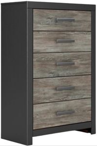 Elevate your bedroom storage with the Broachmyn black/gray 5‑drawer chest from Signature Design by Ashley a piece that blends bold contrast with refined, everyday functionality. This chest features a striking two‑tone finish with a matte black frame and weathered gray oak‑grain drawer fronts that bring depth and modern character to your space.Read More