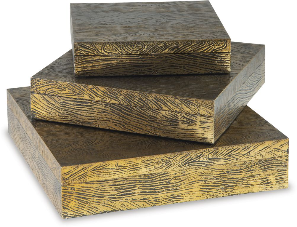 Ideal for a dresser, chest or accent table, this set of three wood and metal boxes is a contemporary choice for the forward-thinking modernist. The antiqued brass-tone finish is an inspired touch.Read More