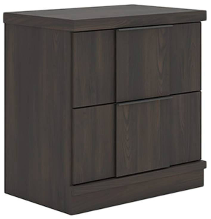 The Shaehartin nightstand features a rich dark brown finish and two roomy drawers. Its compact, functional design provides convenient bedside storage while adding elegant warmth and sturdy practicality to any bedroom setting.Read More